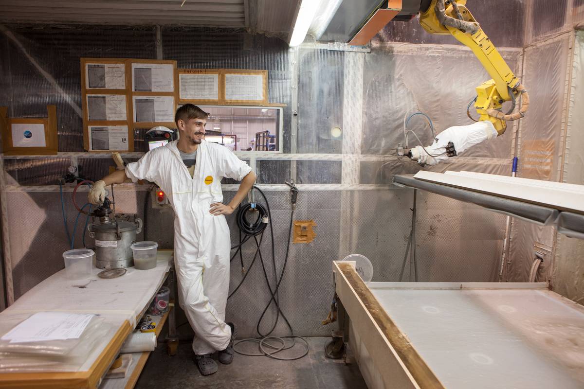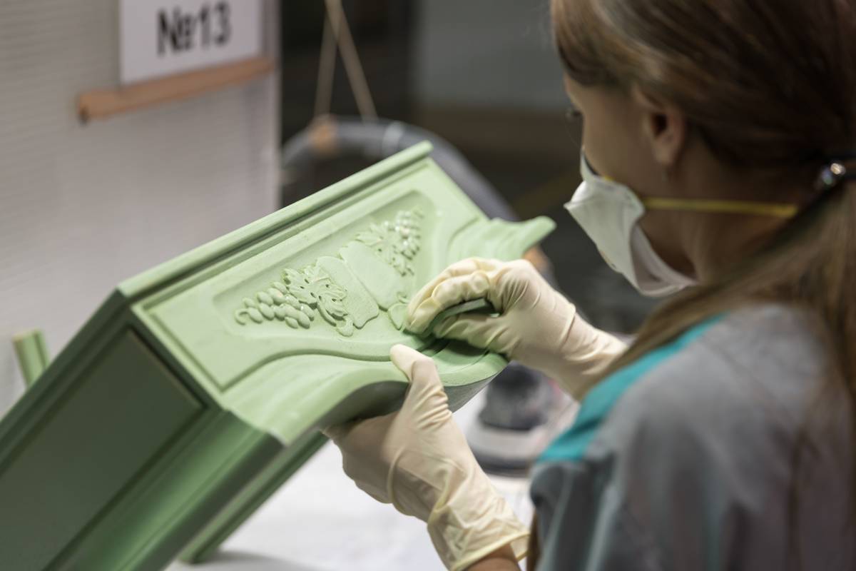 Будущее уже давно наступило — на фабрике роботы и люди, объединив усилия, вместе создают красоту. Фасады из массива, а также все деревянные элементы и столовые группы привозят из Италии, а на фабрике в Саратове их шлифуют, грунтуют и декорируют краской, лаком, патиной. Те же этапы производства проходят и фасады из МДФ. Чтобы получить стабильный тон на всех частях одной кухни, краску наносит робот — его «мастерством» восхищаются даже итальянские партнеры «Марии», бывающие здесь на экскурсиях. Далее полотна вручную расписываются художниками. Их фабрика растит самостоятельно. Мастера учатся по полгода, прежде чем им доверяют расписать целую кухню.